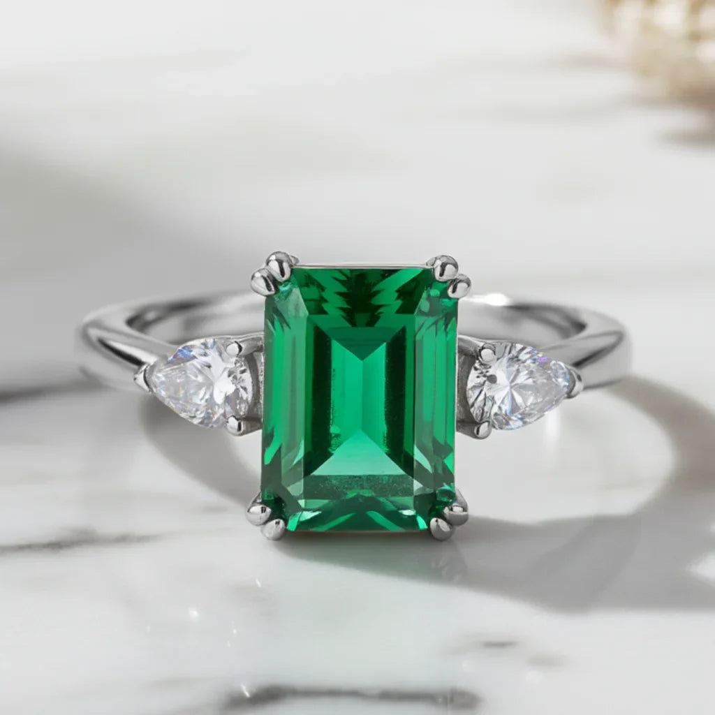 - Gemstone: A dazzling 1.23ct octagon-cut lab emerald and two pear-cut zircon stones.
