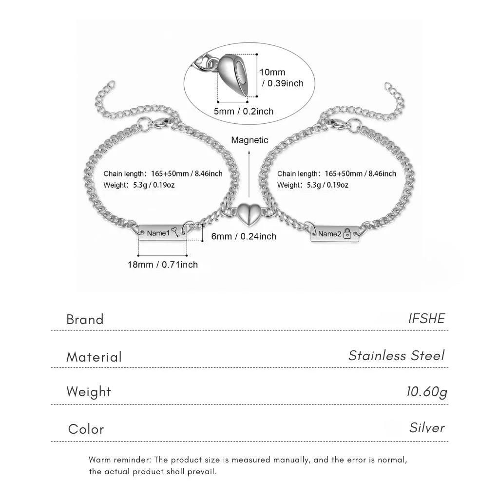 Engraved Bar Magnetic Couple Bracelets with Heart Charm