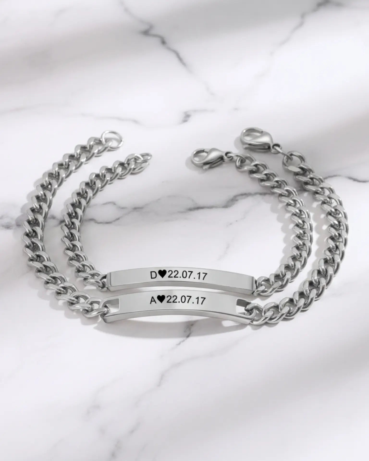 Each bracelet features a durable curb chain connected to a sleek, minimalist engravable bar ID tag. The bar is personalized with your initials and a significant date, creating an unmistakable marker of your eternal love. Crafted from polished, durable metal, this set symbolizes unity and lasting commitment.