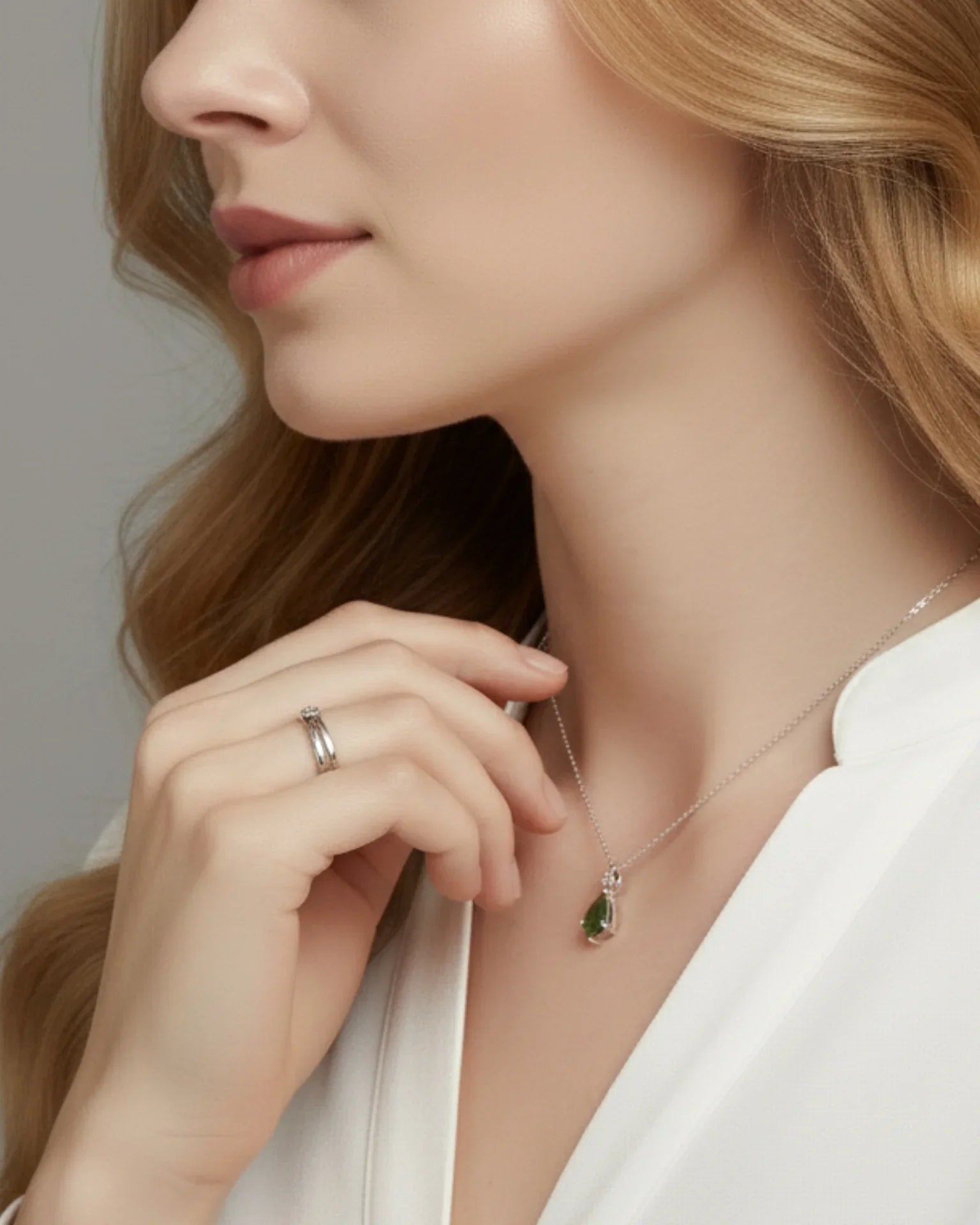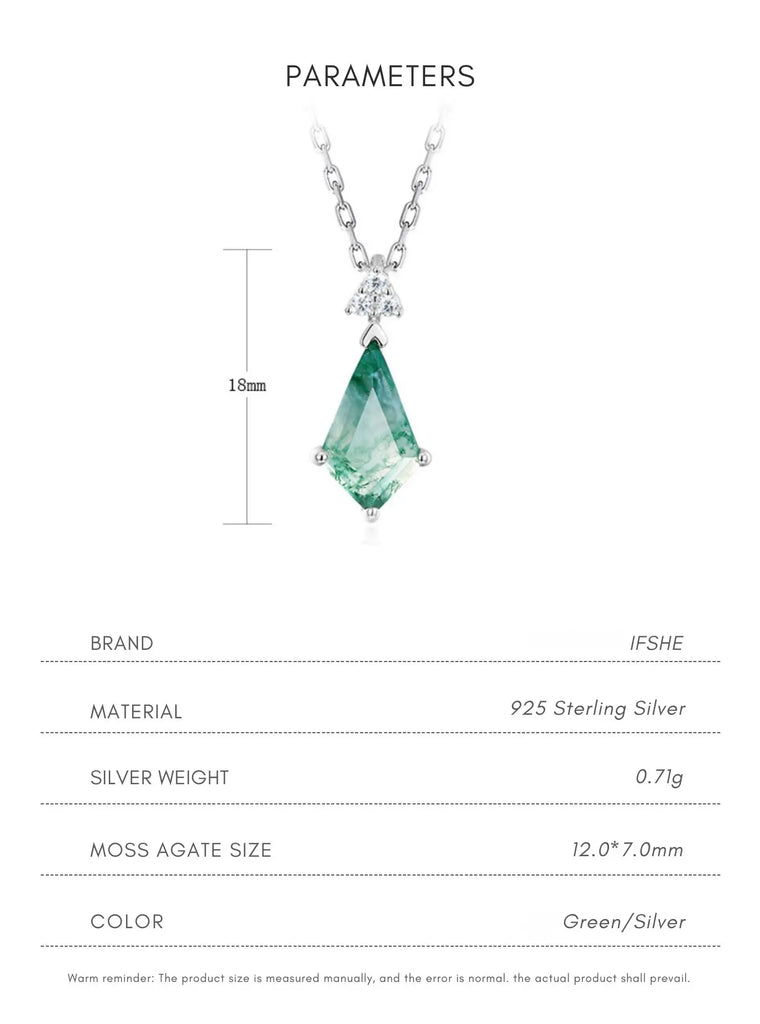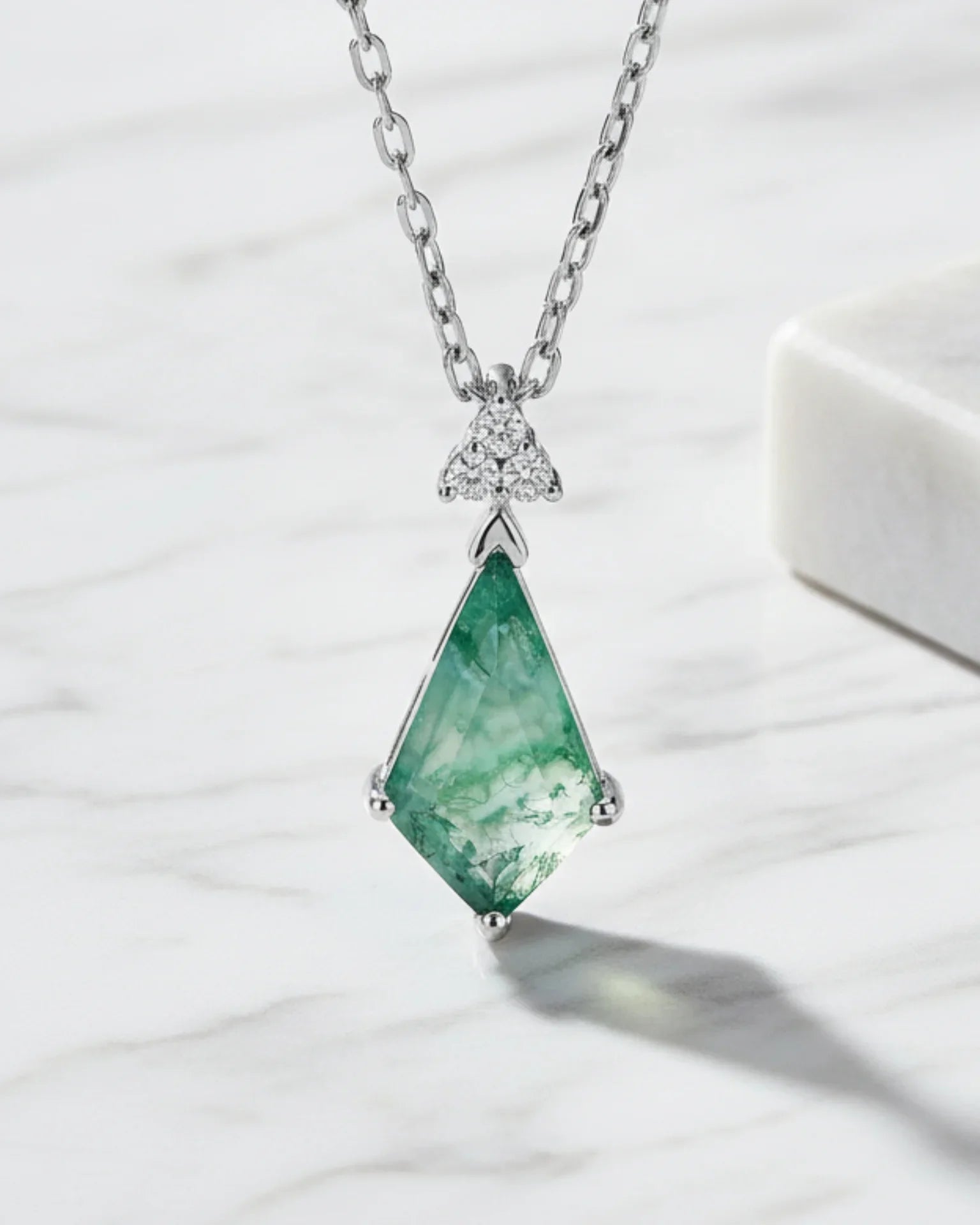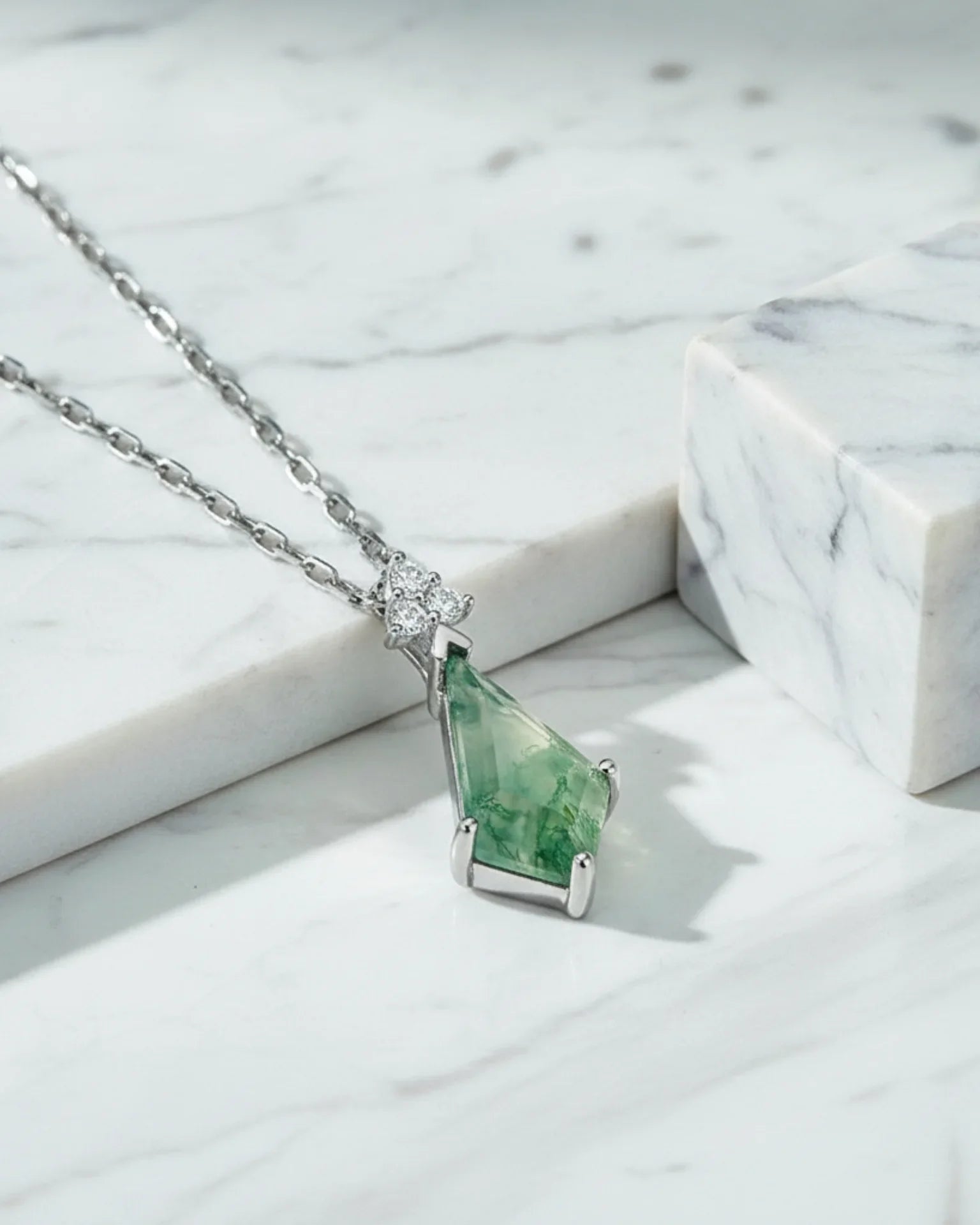 Capture the tranquility of nature with this striking kite-shaped moss agate necklace. Set in luminous 925 sterling silver, the unique green inclusions are complemented by a delicate bail of sparkling zircons. A beautiful, meaningful piece for everyday elegance. Discover more of our beautiful moss agate necklaces or moss agate rings.