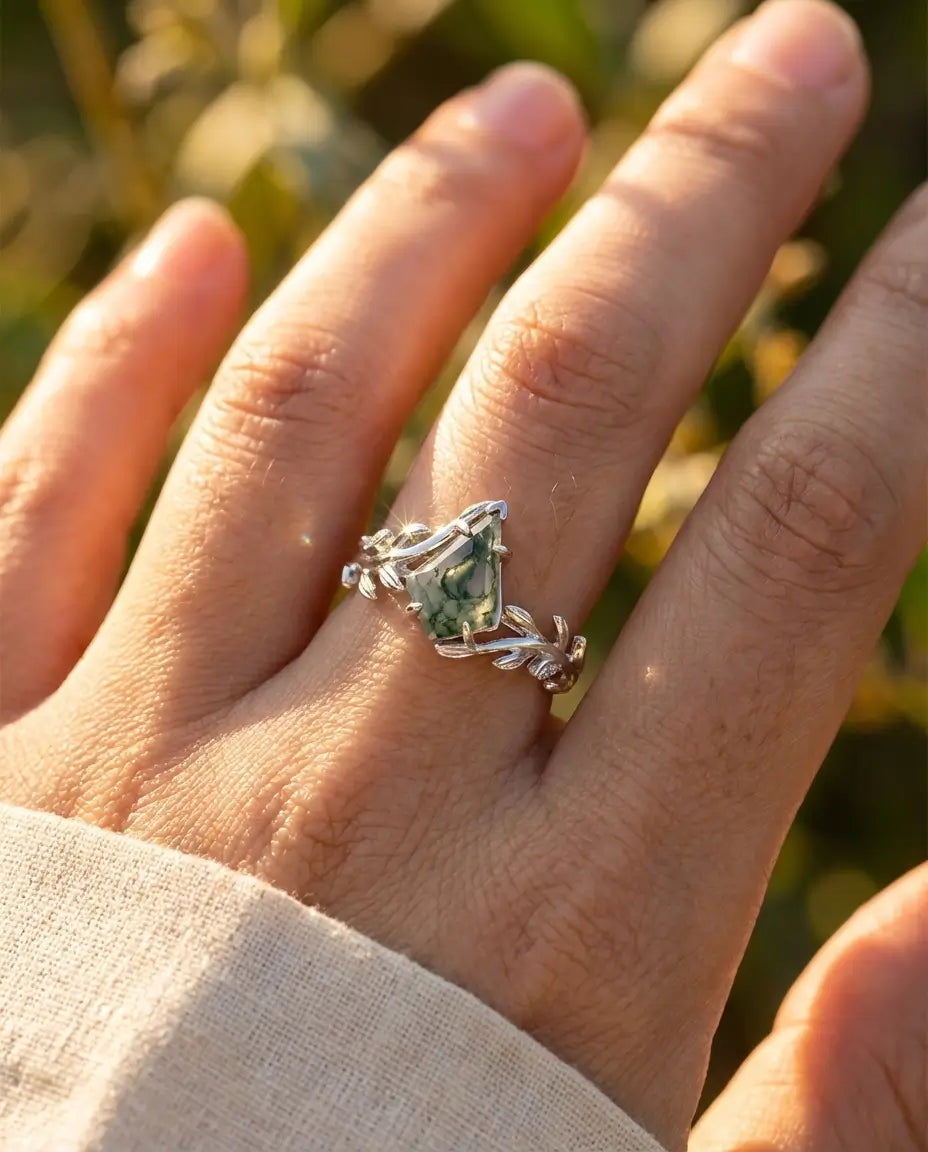 The elongated kite cut elongates the finger and draws the eye to the mesmerizing green inclusions within the stone. Each moss agate is distinct, ensuring your ring is unlike any other. For those intrigued by the spiritual connection of these stones, we invite you to read our deep dive into the meaning and healing properties of moss agate to understand why it is called the stone of new beginnings.