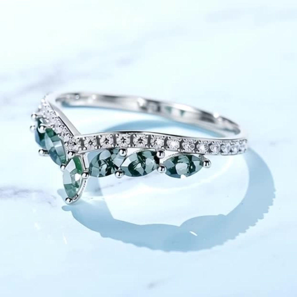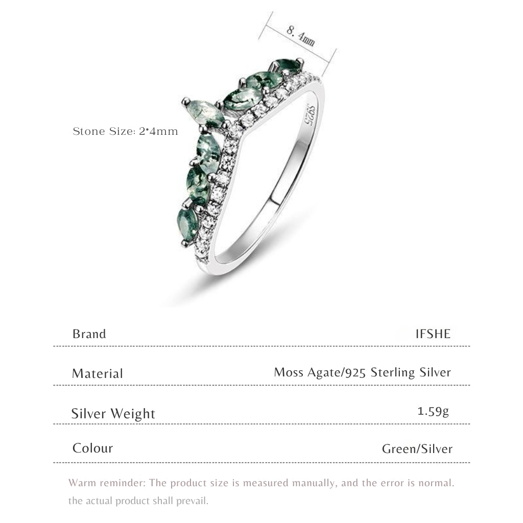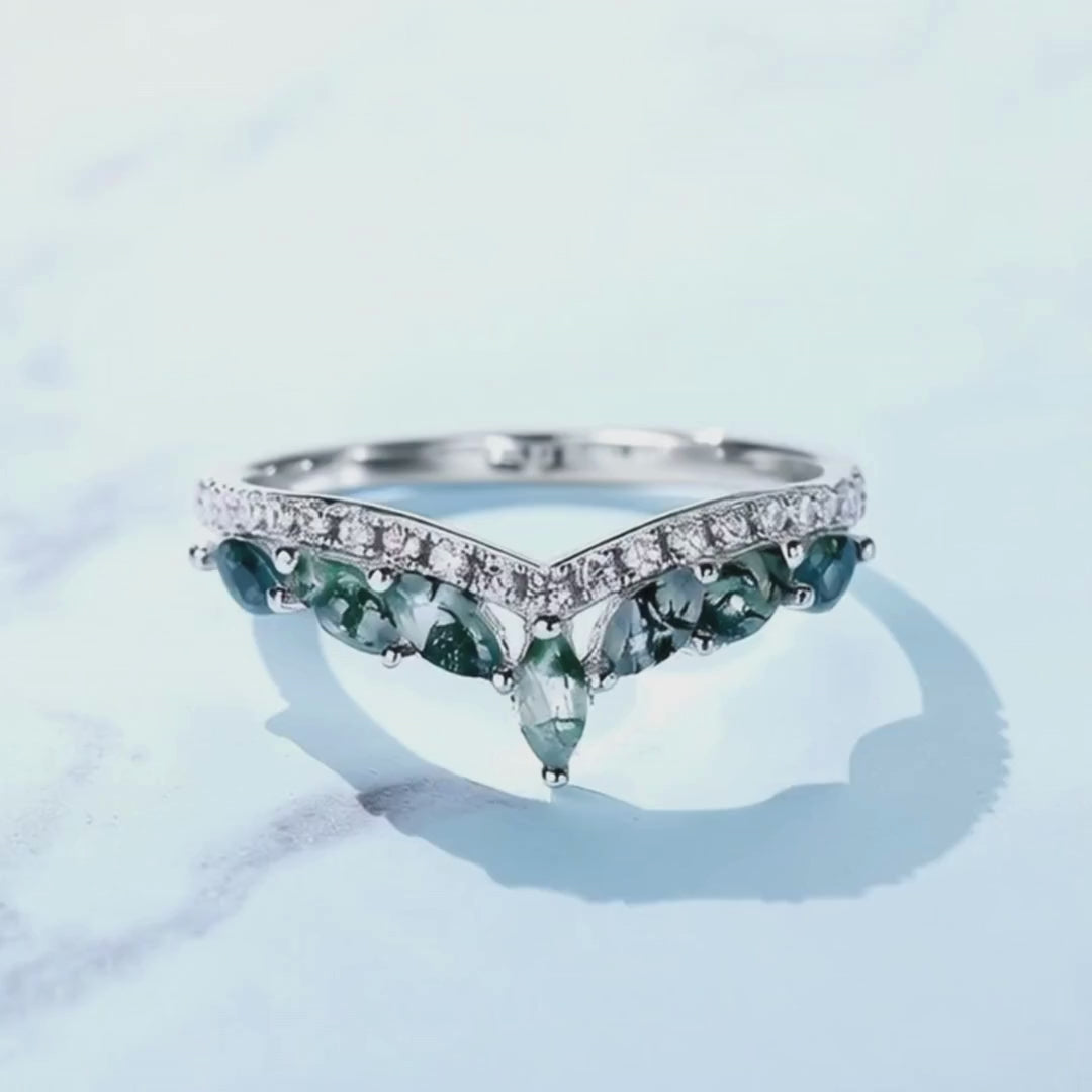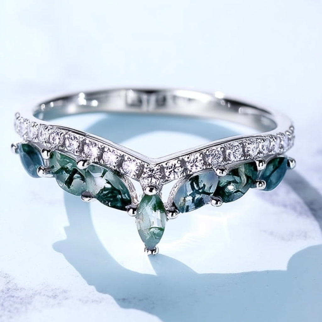 Elevate your style with this enchanting Moss Agate crown ring. Crafted from genuine 925 sterling silver, this distinctive V-shape band features a row of captivating, marquise-cut green moss agate stones nestled beneath a sparkling line of cubic zirconia. The nature-inspired design makes it a truly unique piece. Perfect as a striking everyday accessory or a cherished anniversary gift for her. Discover more of our beautiful moss agate rings.