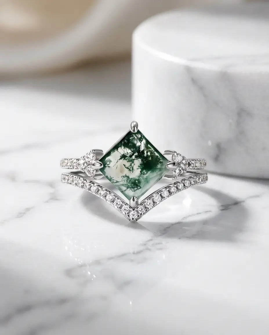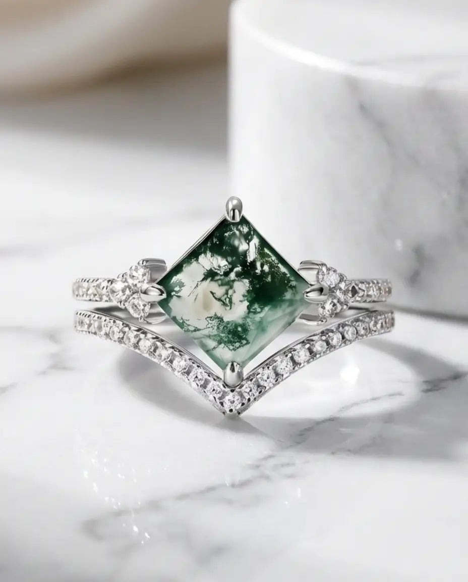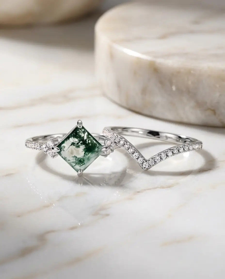 Celebrate the perfect union of modern geometry and organic beauty with this Princess-Cut Moss Agate Bridal Set. The engagement ring features a 7x7mm princess-cut moss agate, uniquely set in a "kite" orientation to create a dynamic rhombus silhouette. It is perfectly framed by a matching V-shaped (chevron) wedding band, paved with sparkling zircons that nestle against the main ring, symbolizing two lives joining together in flawless harmony.