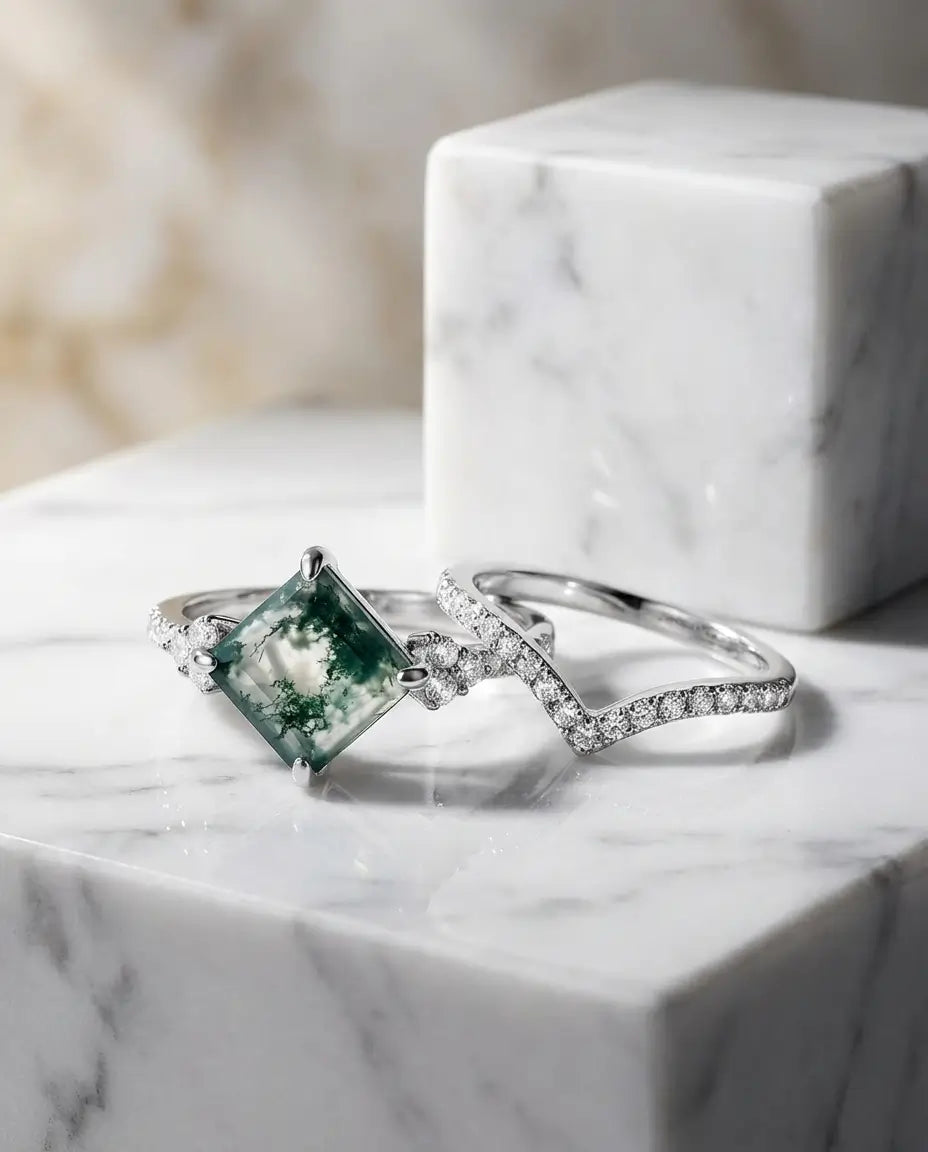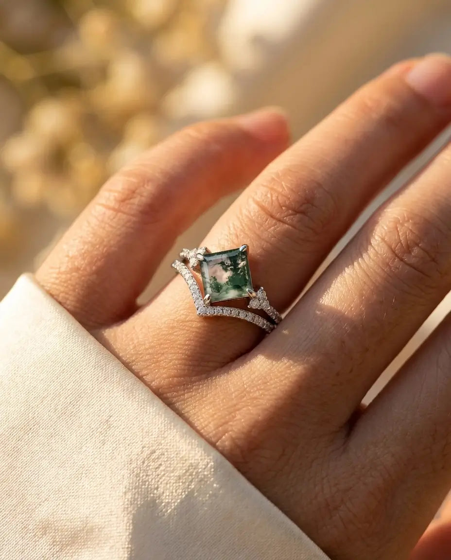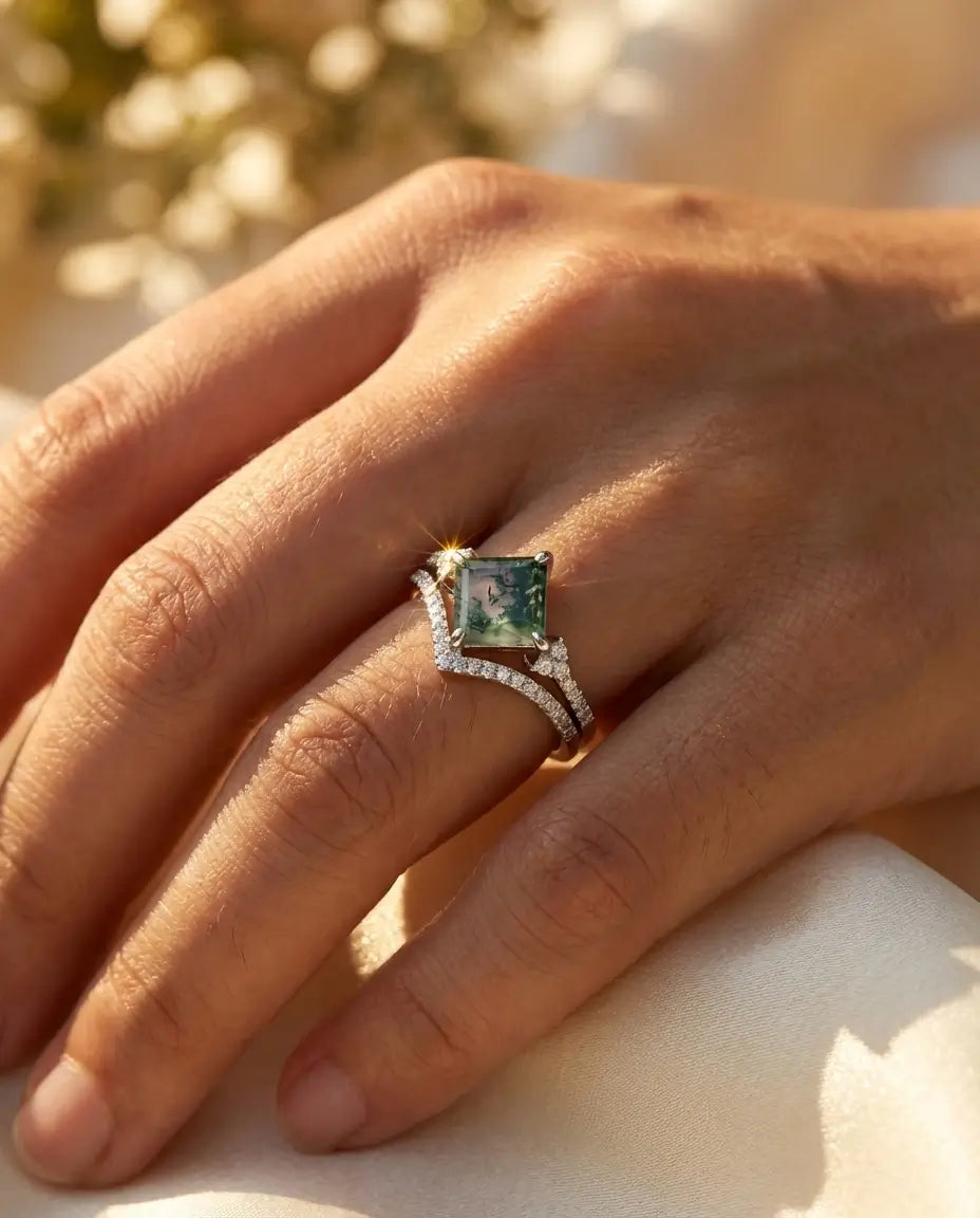 Celebrate the perfect union of modern geometry and organic beauty with this Princess-Cut Moss Agate Bridal Set. The engagement ring features a 7x7mm princess-cut moss agate, uniquely set in a "kite" orientation to create a dynamic rhombus silhouette. It is perfectly framed by a matching V-shaped (chevron) wedding band, paved with sparkling zircons that nestle against the main ring, symbolizing two lives joining together in flawless harmony.