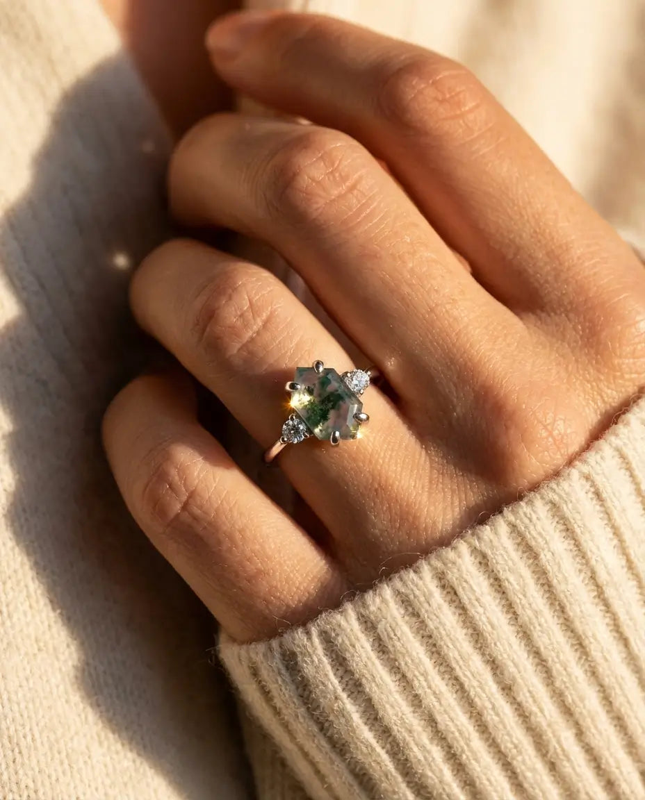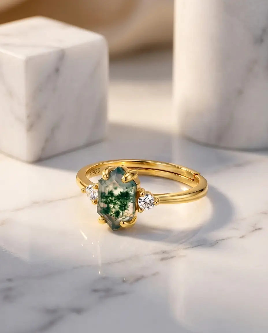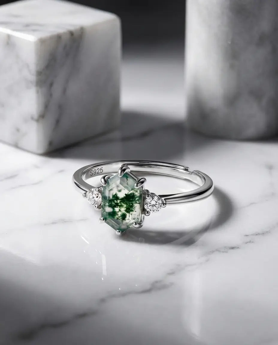 The geometric hexagon cut offers a modern edge to the organic beauty of the stone. Within the agate, natural green inclusions weave unique patterns reminiscent of a misty woodland. Because these are formed by nature, your ring is a one-of-a-kind treasure. To explore the deeper significance of this gem, we invite you to read our comprehensive guide on the meaning and healing benefits of moss agate, a stone known for fostering emotional balance.