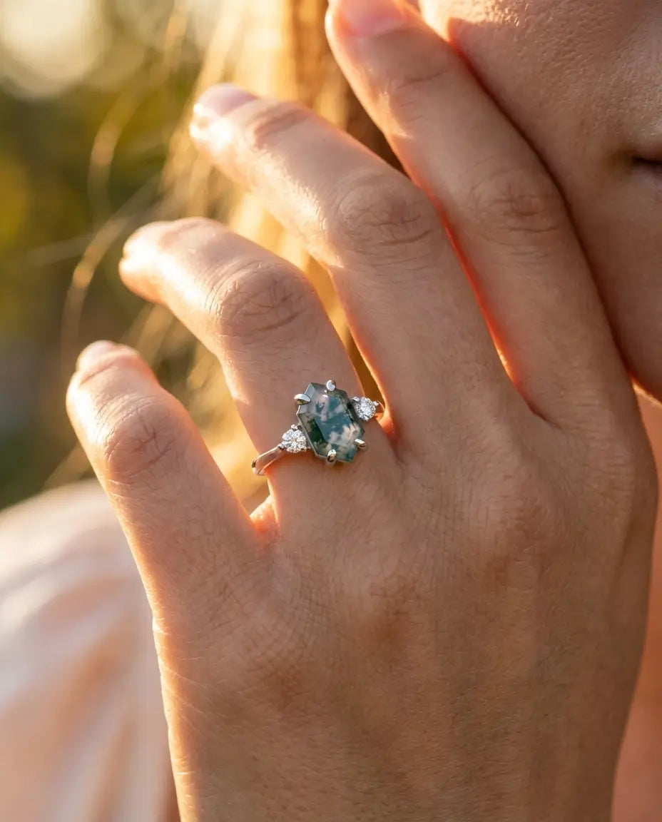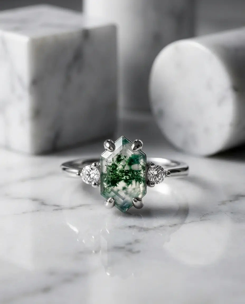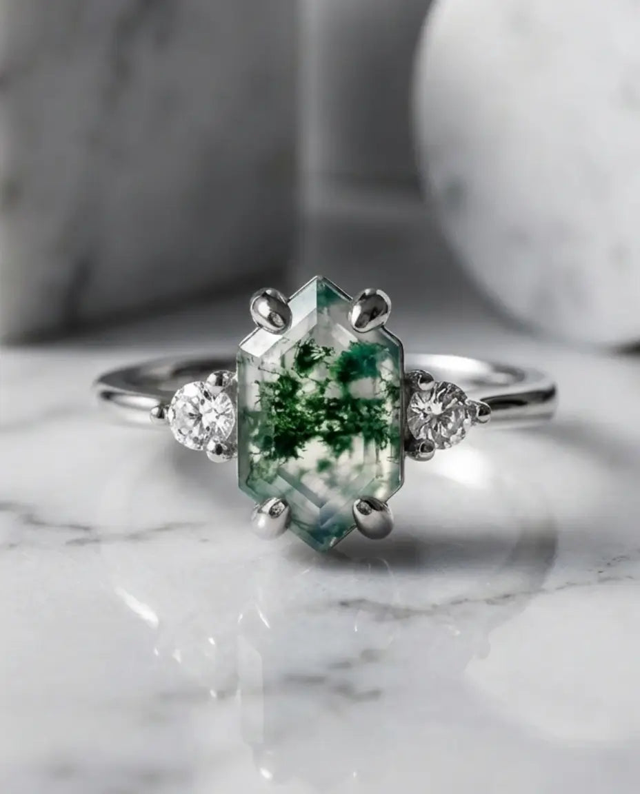 The geometric hexagon cut offers a modern edge to the organic beauty of the stone. Within the agate, natural green inclusions weave unique patterns reminiscent of a misty woodland. Because these are formed by nature, your ring is a one-of-a-kind treasure. To explore the deeper significance of this gem, we invite you to read our comprehensive guide on the meaning and healing benefits of moss agate, a stone known for fostering emotional balance.