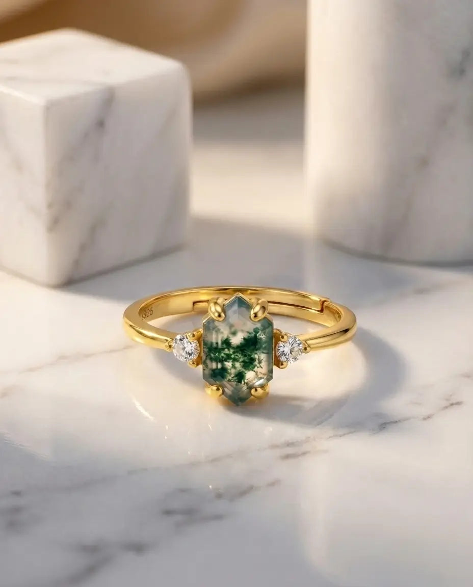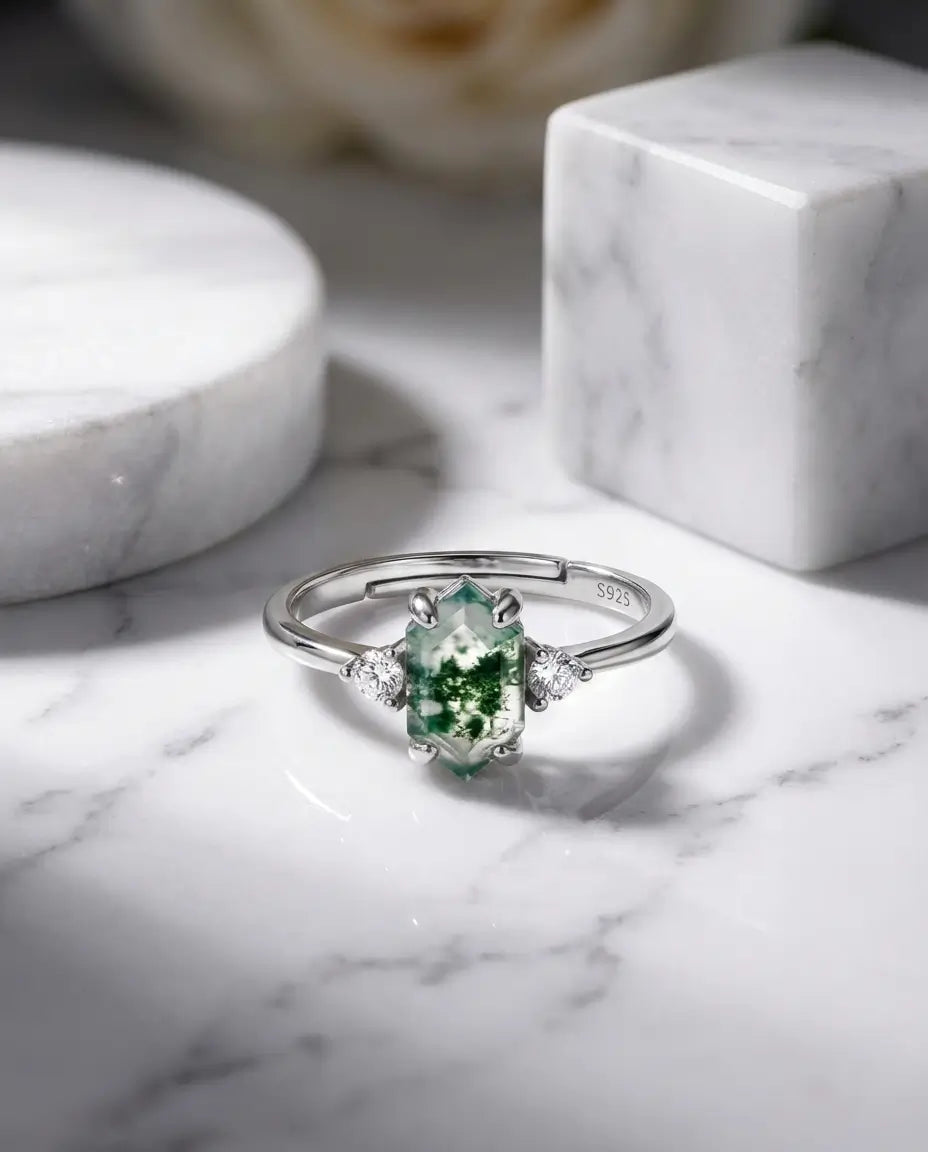 Celebrate your journey with this captivating Hexagon Moss Agate Adjustable Ring. Featuring a classic "Trilogy" design, the central 5x10mm elongated hexagon moss agate is flanked by two sparkling round zircons. This three-stone arrangement is traditionally cherished for symbolizing the past, present, and future of a relationship, making it a piece rich in sentiment and style.