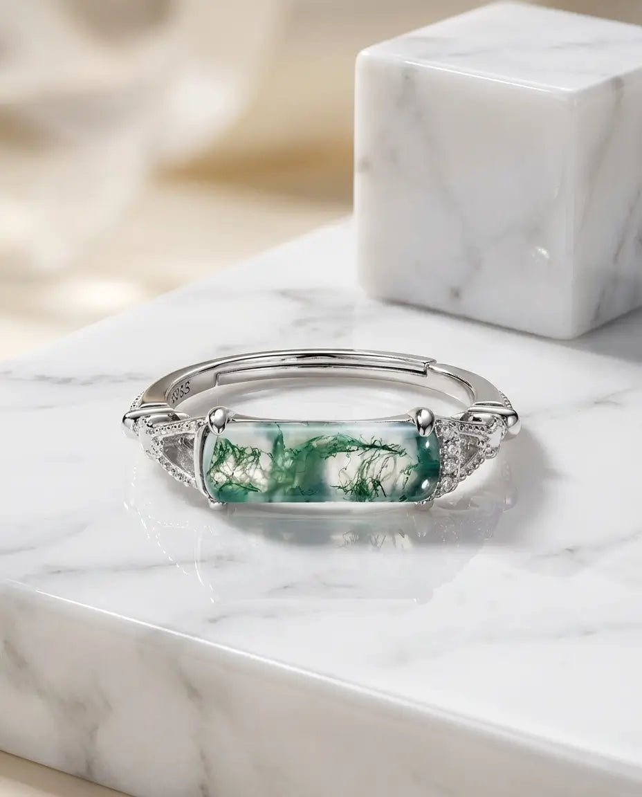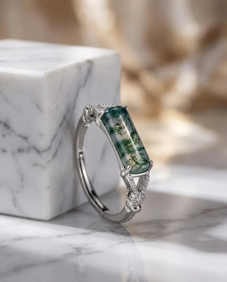 The elongated rectangular cut acts as a panoramic window into the gemstone. Inside, green mineral inclusions stretch across the stone like a distant forest horizon. Because these patterns are naturally formed, your ring is a guaranteed original. To appreciate the depth of this gemstone, we invite you to read our comprehensive guide on the meaning and healing benefits of moss agate, a stone celebrated for its connection to nature and emotional stability.