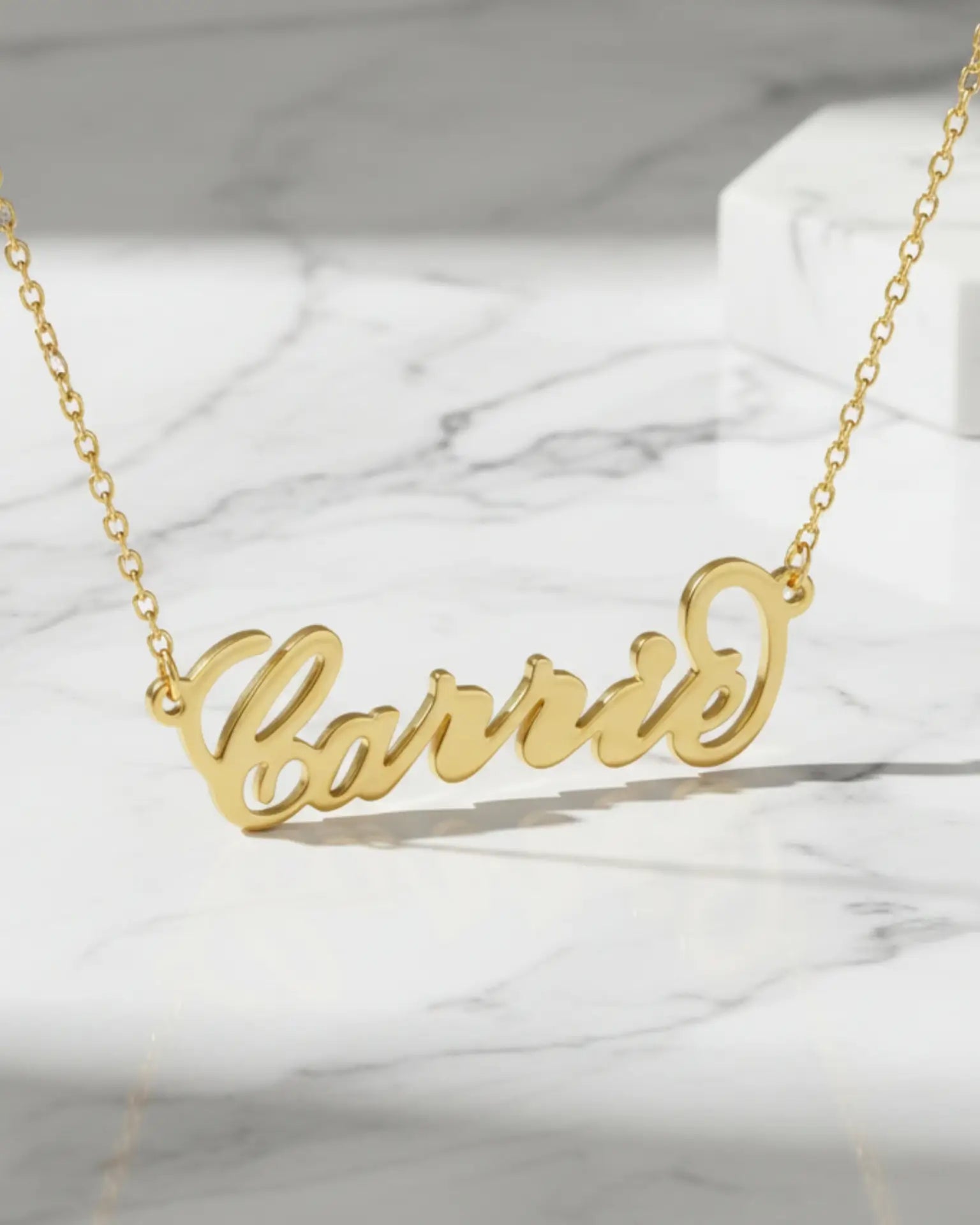 Own the style that launched a thousand trends with our Personalized Carrie Script Name Necklace. This piece of jewelry is instantly recognizable, capturing the effortless confidence, femininity, and chic urban style of a true fashion icon. It’s a nostalgic tribute to a beloved era, yet its personalized nature ensures it’s completely unique to your own identity.