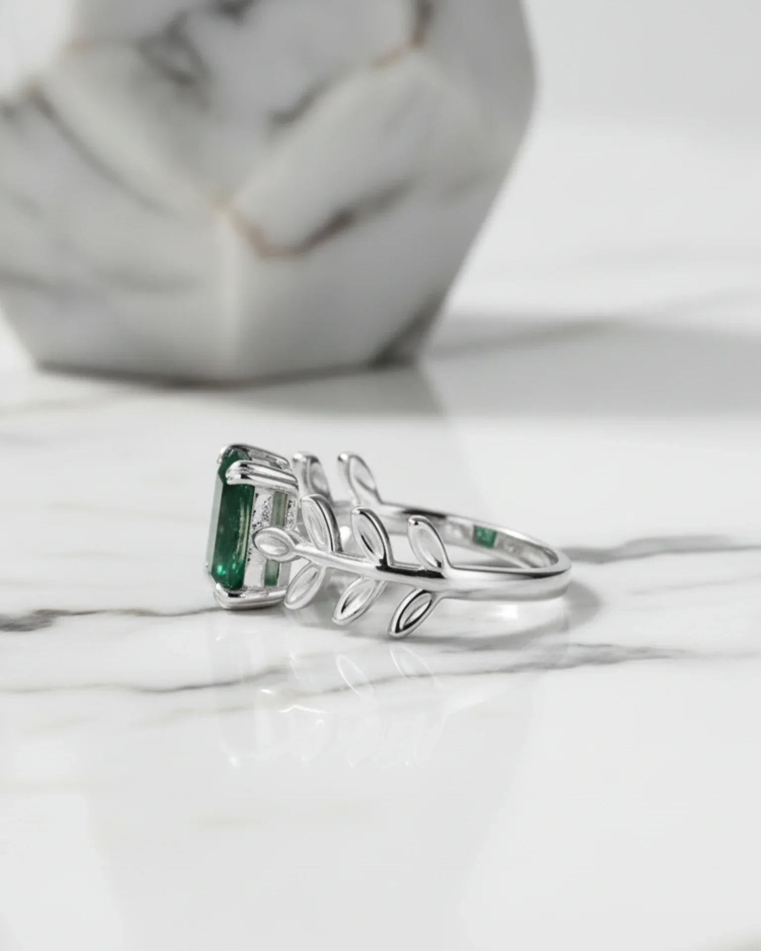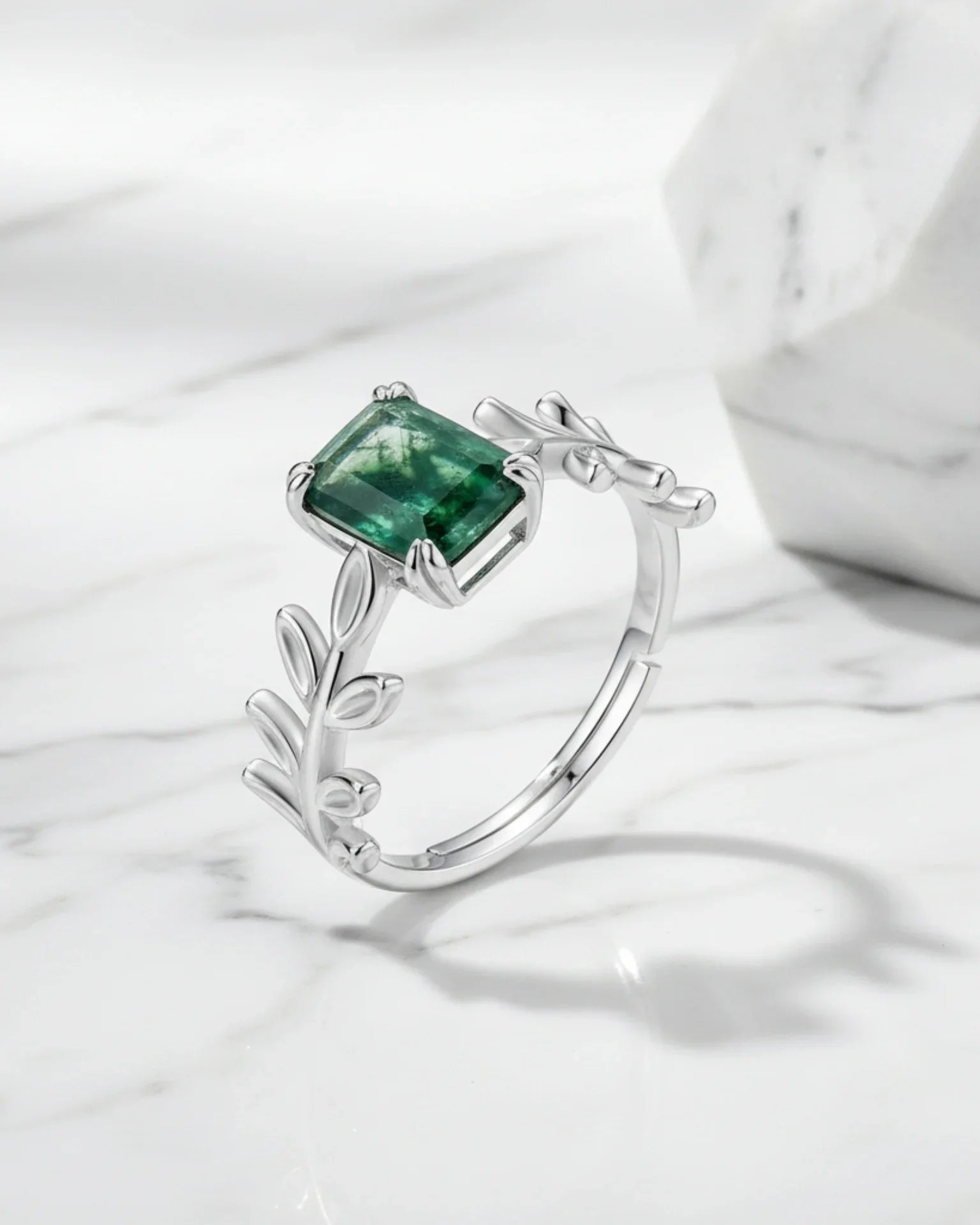 Capture the beauty of the forest with this exquisite, adjustable open-band ring. Featuring a deep green, emerald cut moss agate centerpiece set in polished 925 sterling silver, and accented by delicate leaf details. A perfect, nature-inspired accessory.