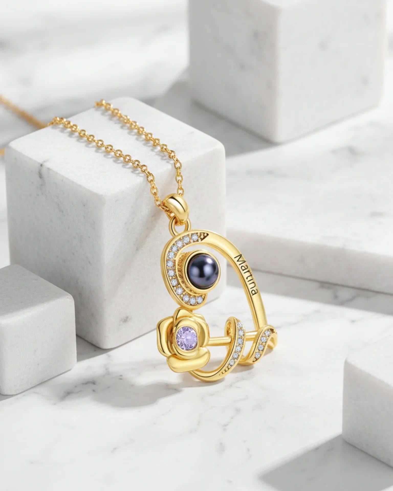 Personalized Heart Rose Photo Projection Necklace with Name Engraving & Birthstone