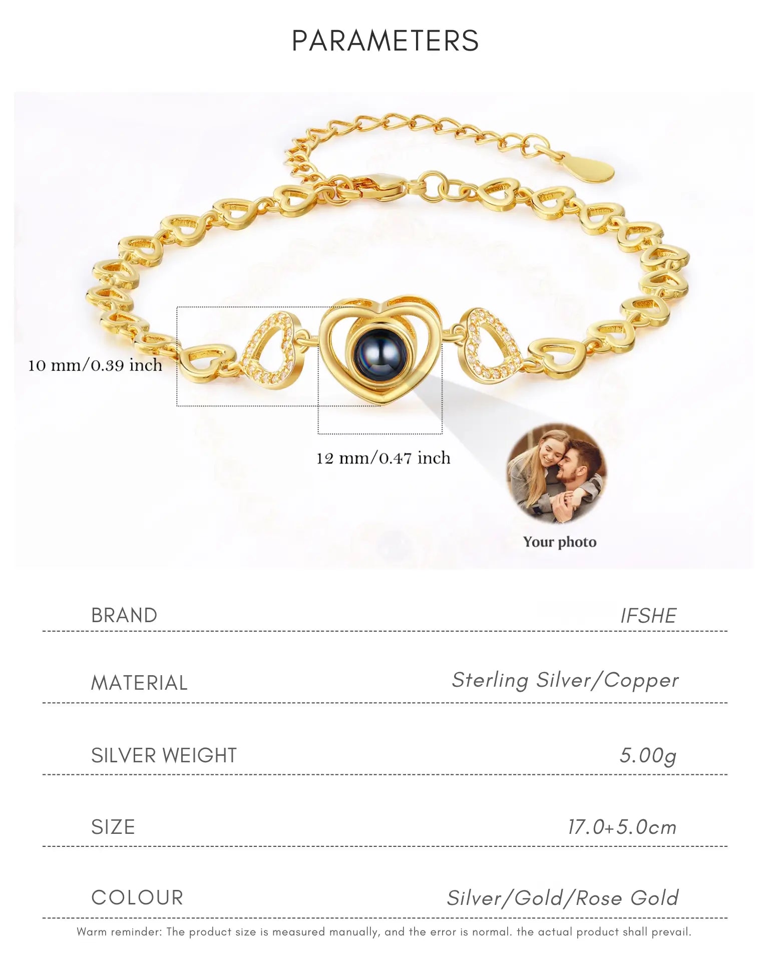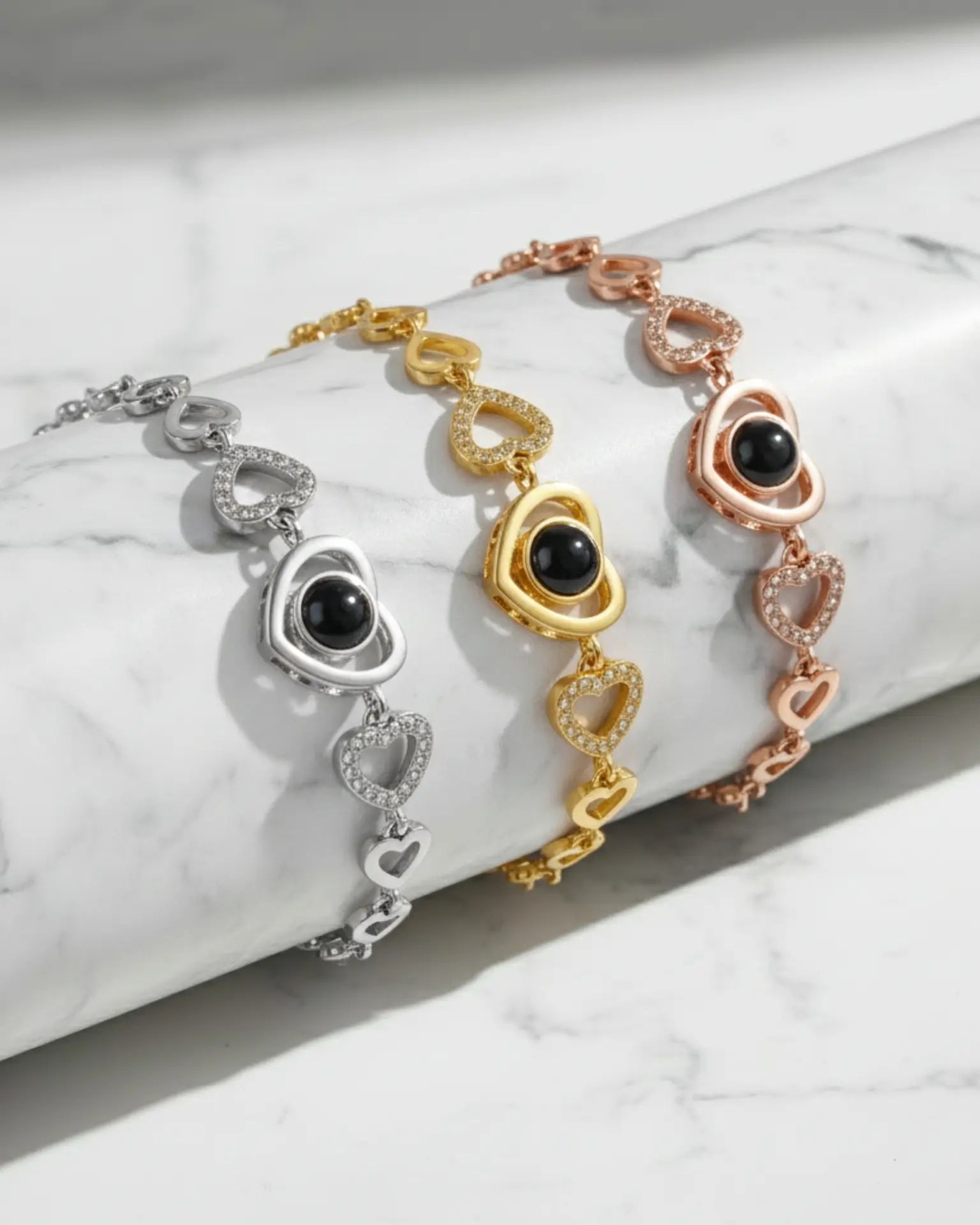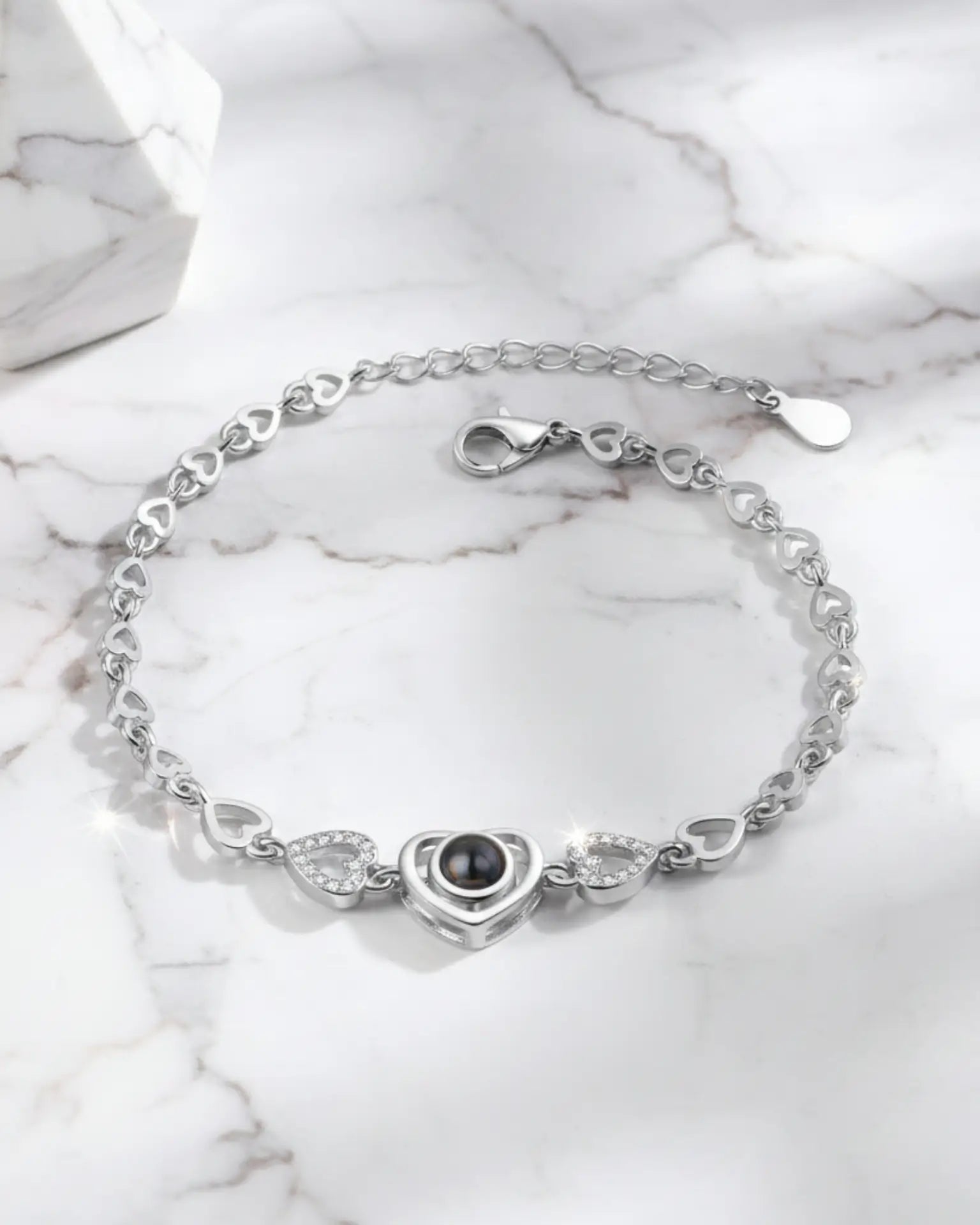 Carry your most cherished moment wherever you go with our Intimate Memory Photo Projection Bracelet. This personalized jewelry piece represents an unforgettable memory and close connection, allowing you to hide a special picture inside the central heart pendant. Simply shine your phone flashlight through the stone to project the image onto a wall, or look closely to see the hidden photo.