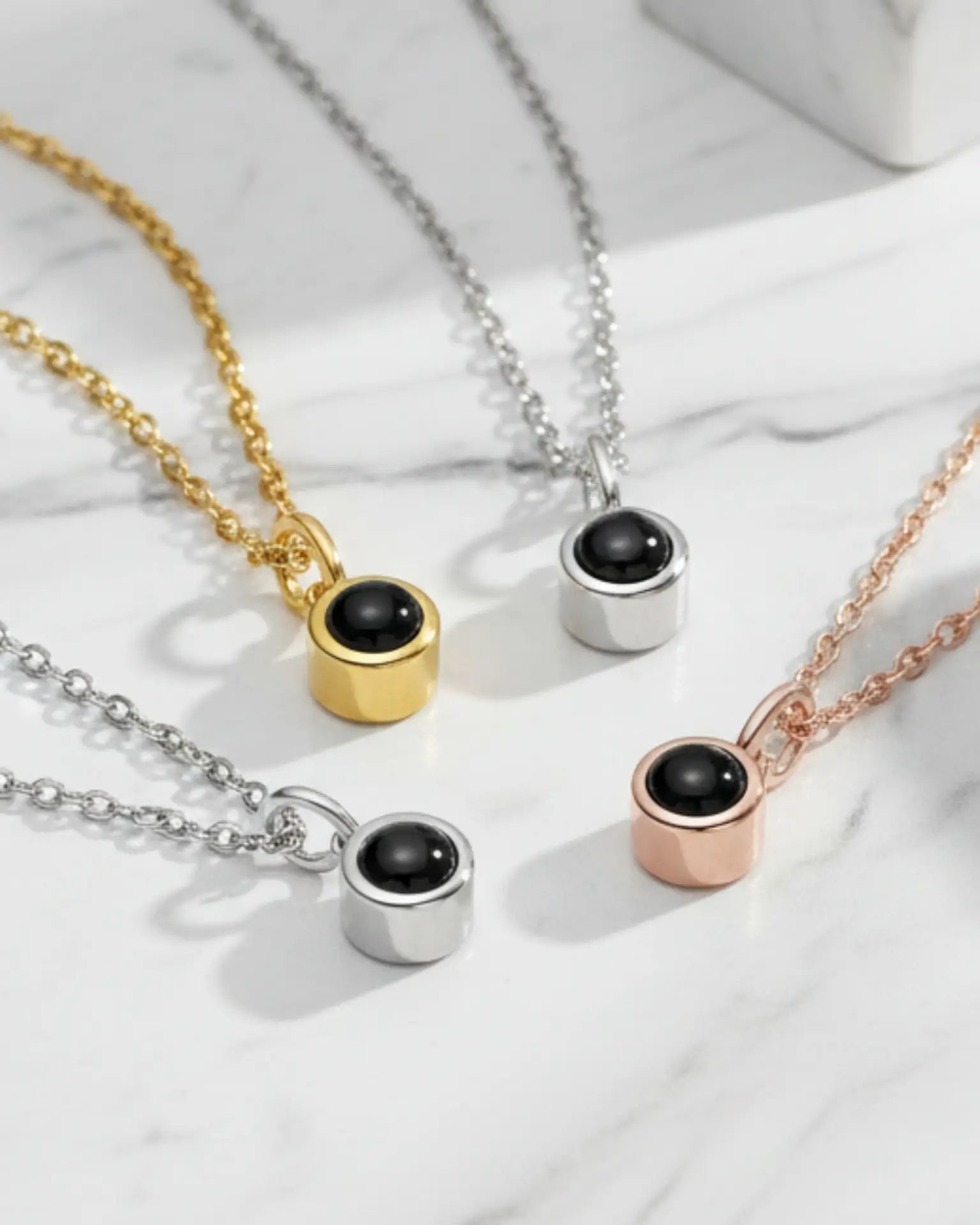 The small, round pendant discreetly houses our innovative micro-projection lens, which is personalized with your chosen photograph. Crafted from a durable Copper base, the necklace is available in four versatile finishes: Silver, Gold, Rose Gold, and a sleek Black/Silver option. Its simple design makes it perfect for layering with other necklaces or wearing solo.