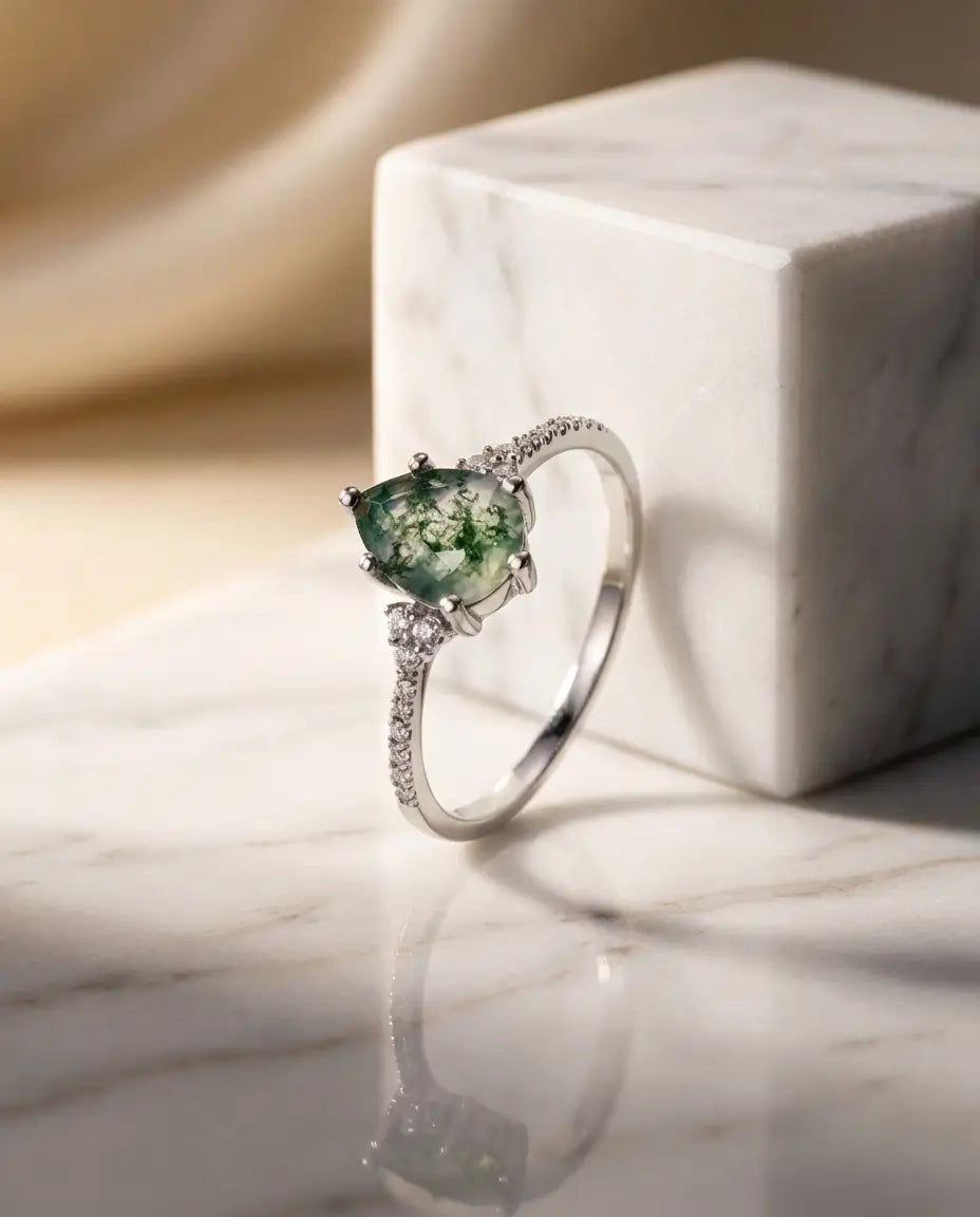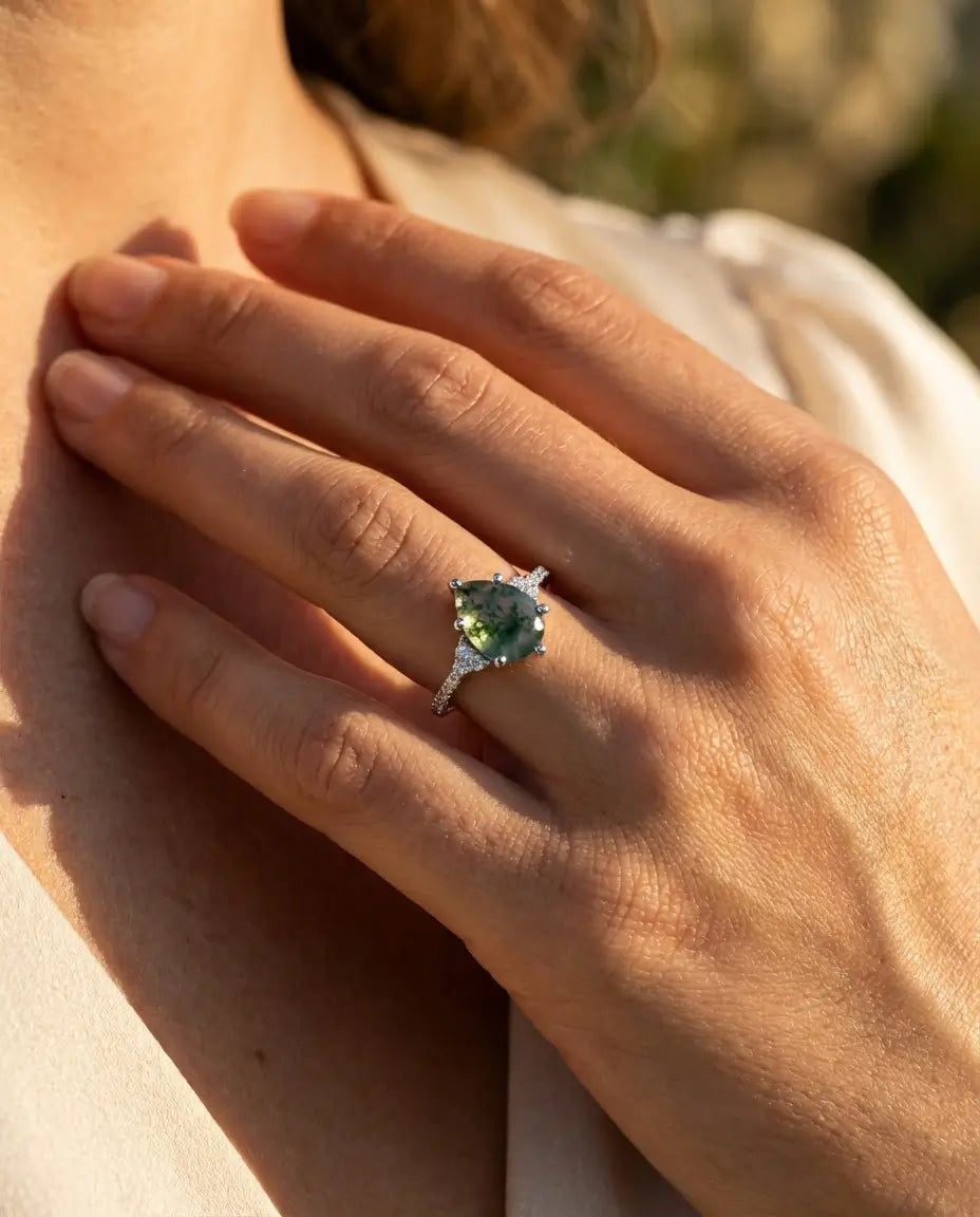 Pear-Shaped Moss Agate Ring - Pave Shoulder Teardrop Design in Silver or Gold