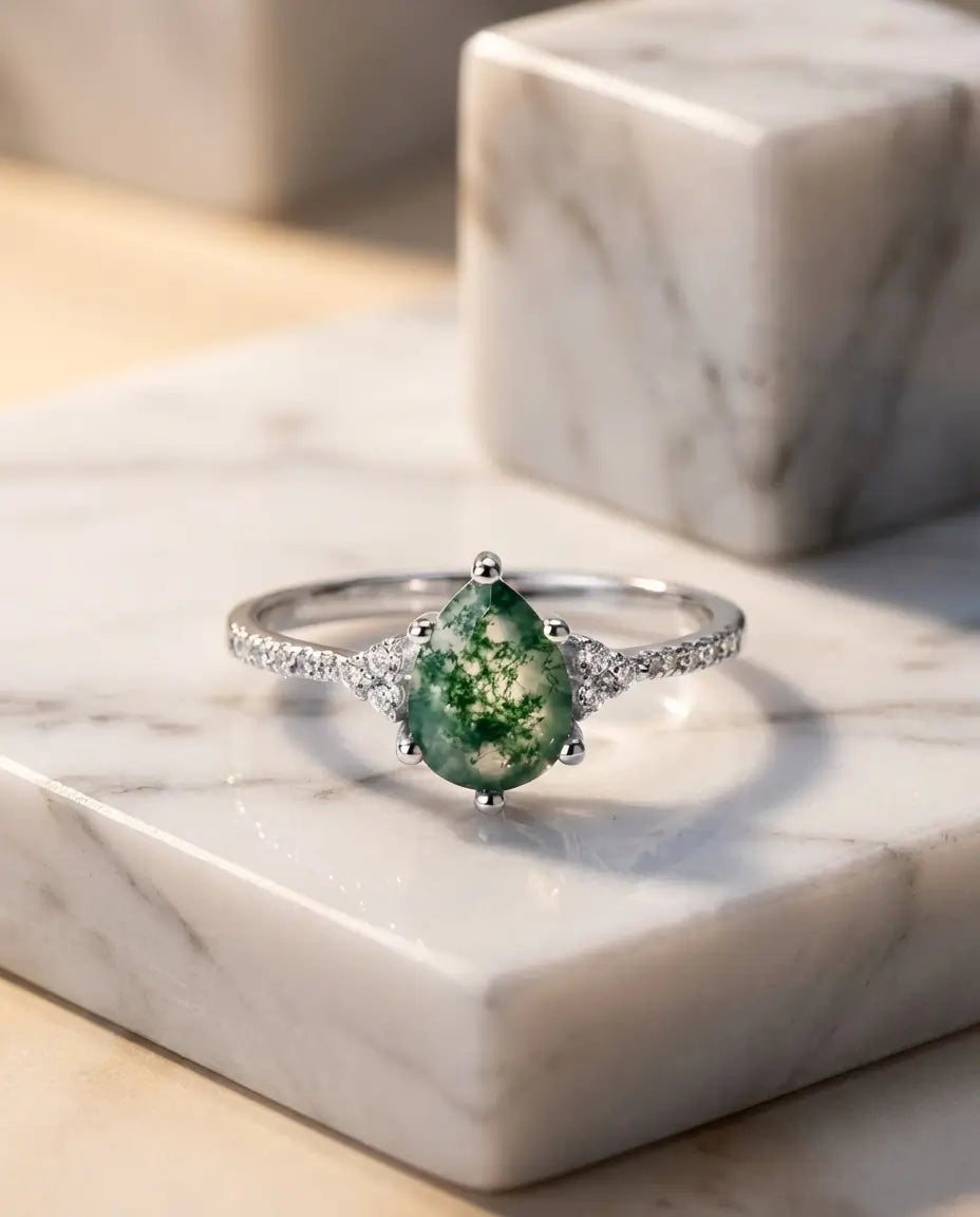 Embrace the subtle beauty of the wild with this exquisite Pear-Shaped Moss Agate Ring. The centerpiece is a 6x8mm teardrop moss agate, a shape celebrated for its ability to elongate and flatter the finger. It is flanked by a delicate cluster of three round zircons on each shoulder, leading into a shimmering pavé-set band. This design creates a seamless flow of light that draws the eye directly to the unique green landscapes within the central stone.